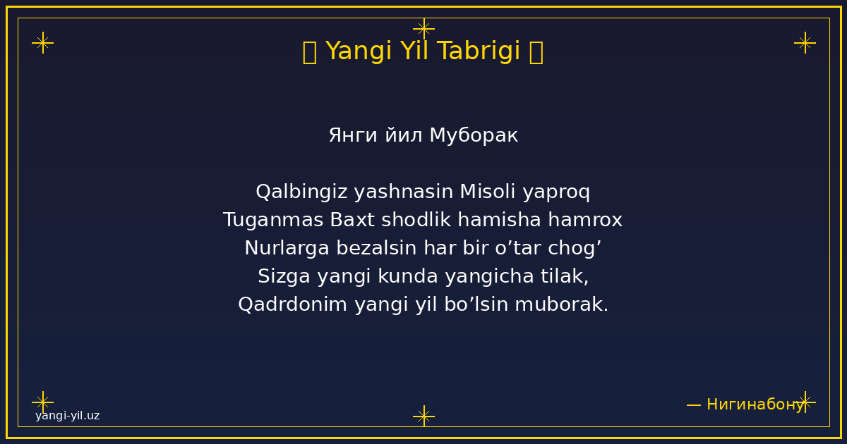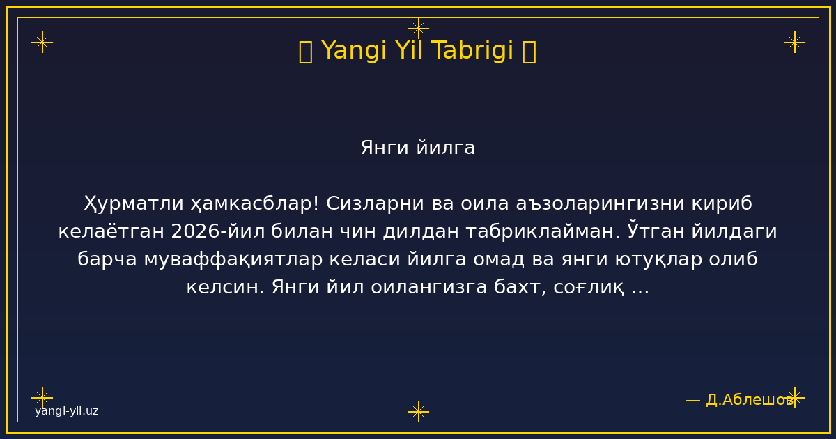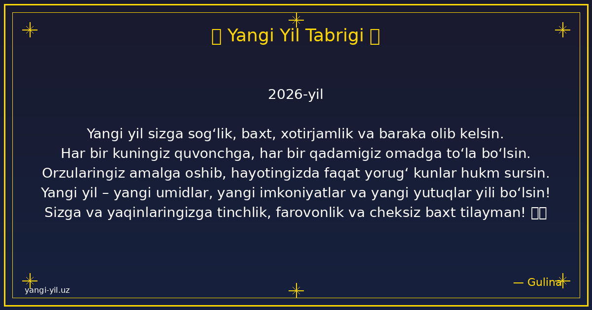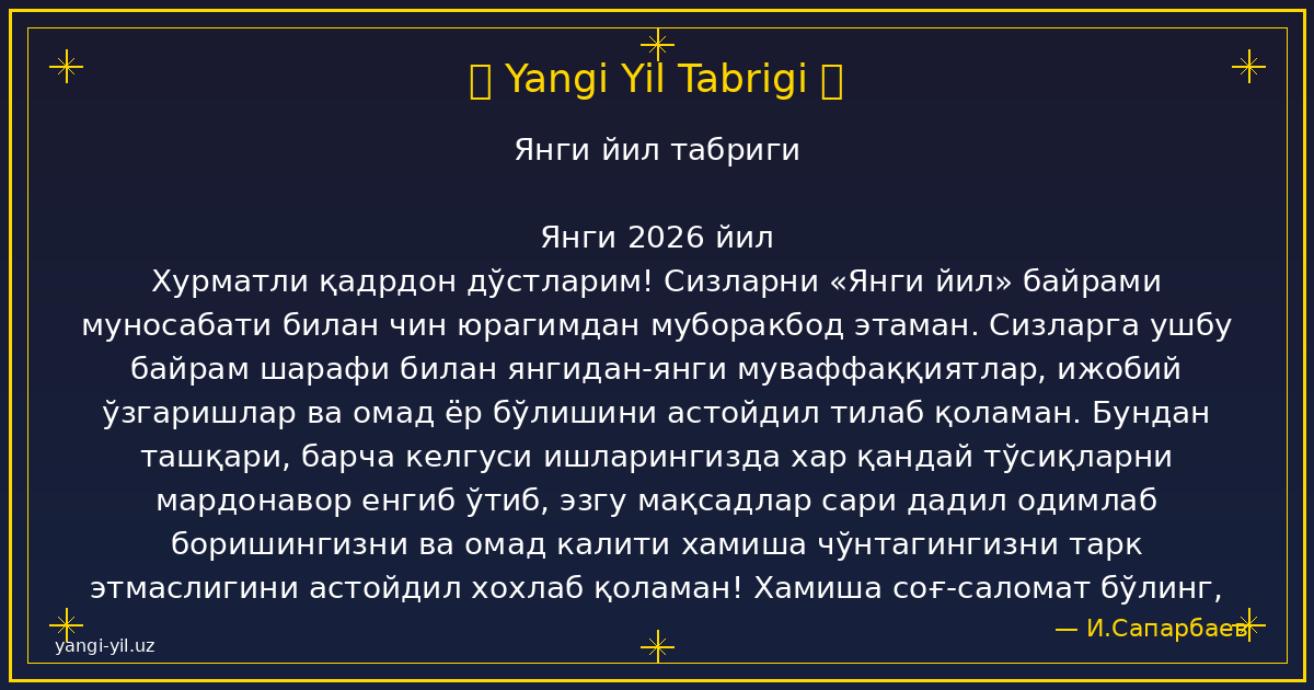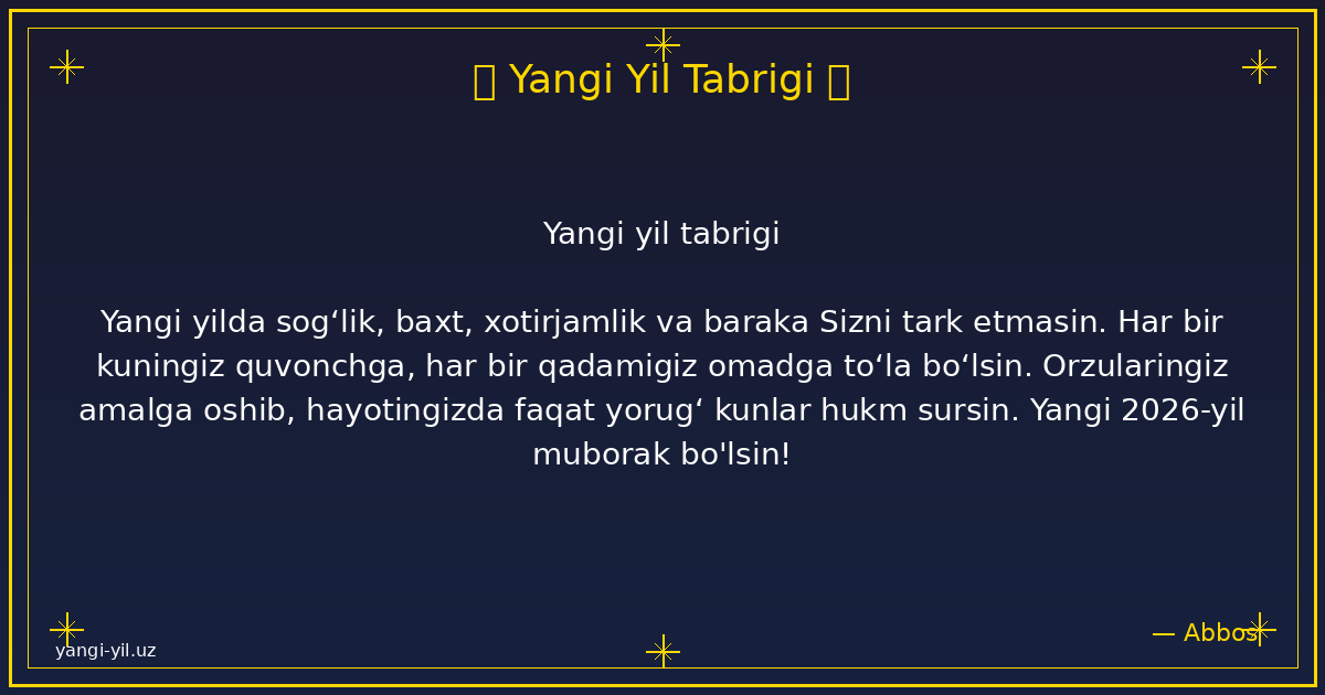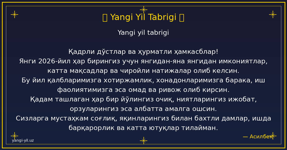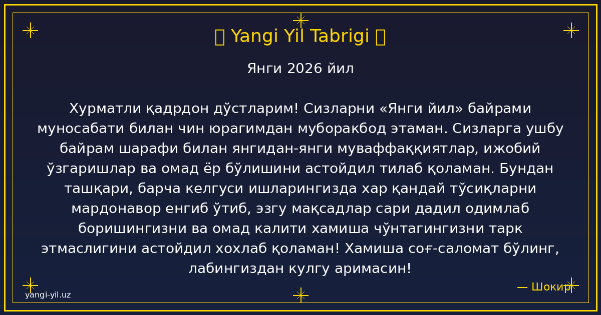 Yangi yil sizga sog‘lik, baxt, xotirjamlik va baraka olib kelsin. Har bir kuningiz quvonchga, har bir qadamigiz omadga to‘la bo‘lsin. Orzularingiz amalga oshib, hayotingizda faqat yorug‘ kunlar hukm sursin. Yangi …