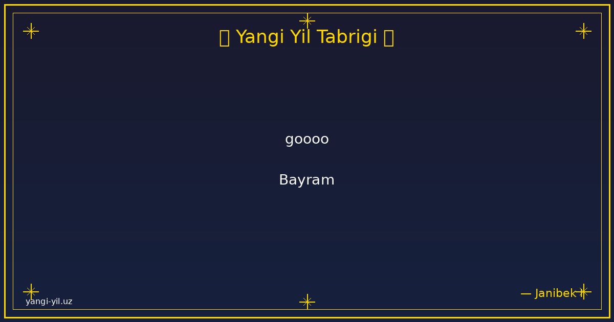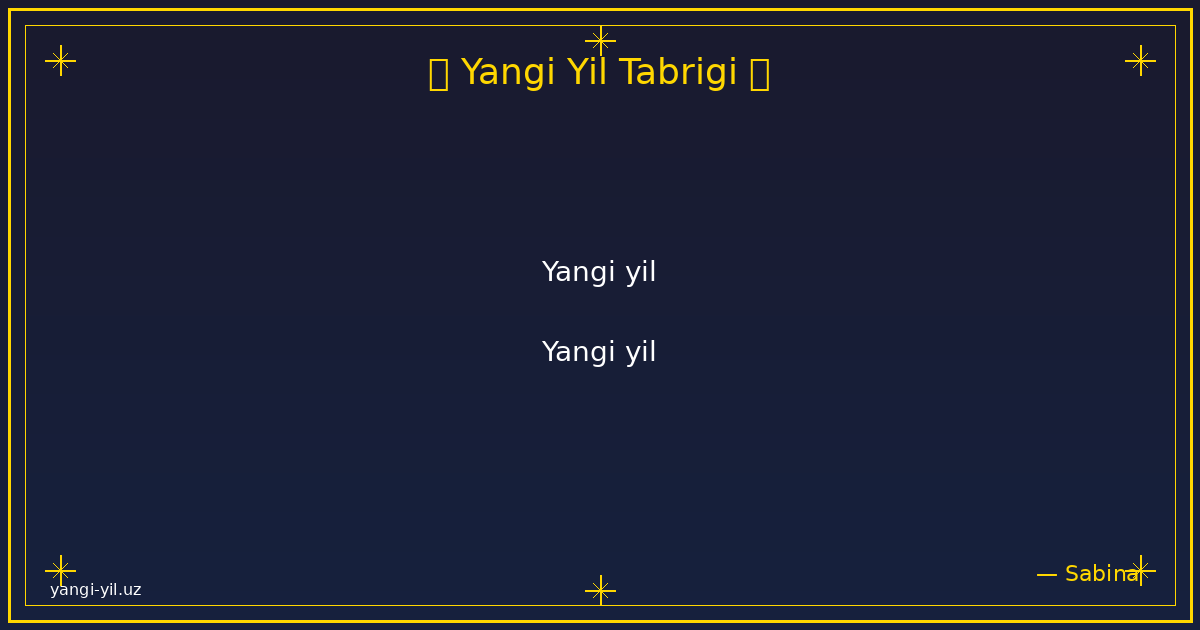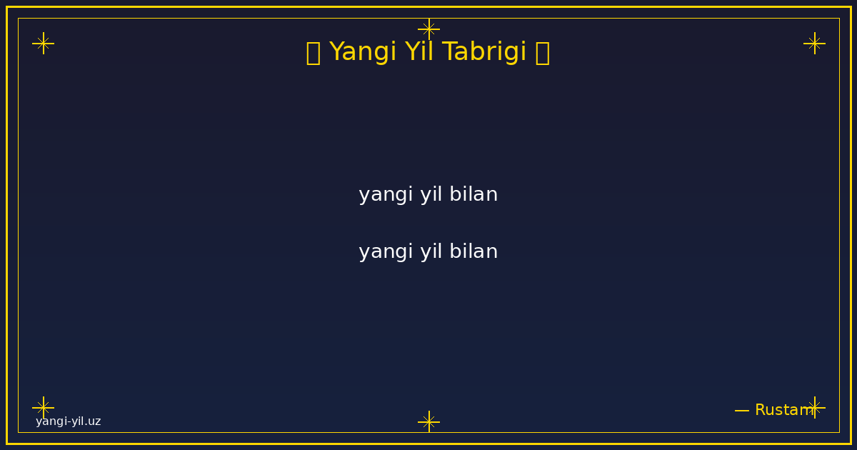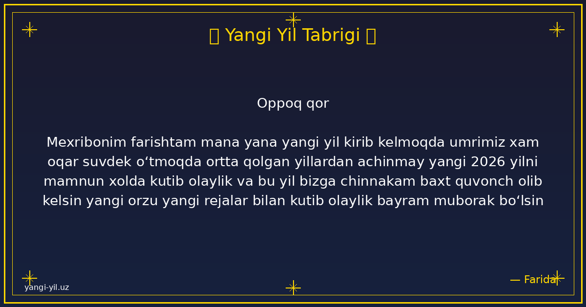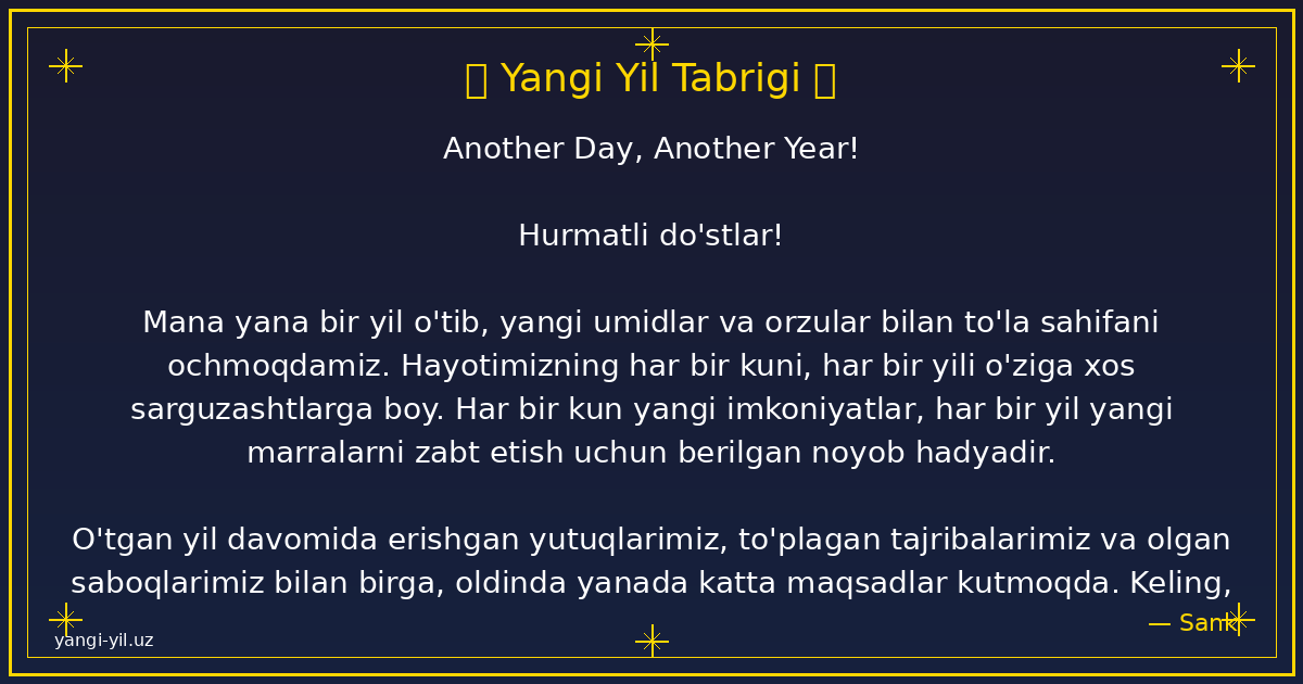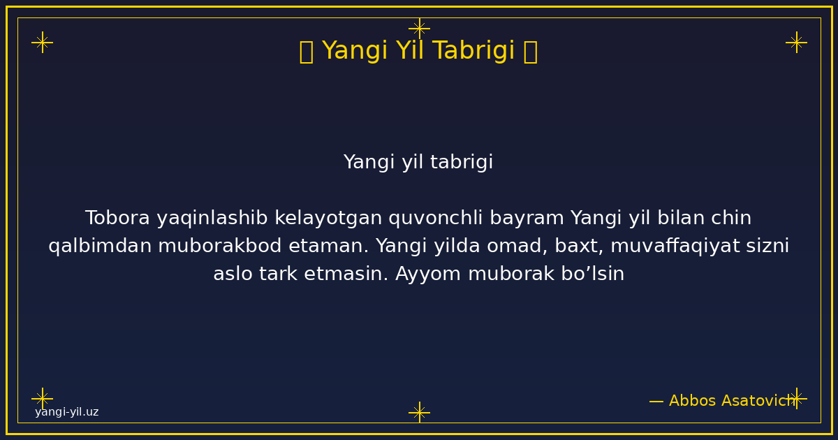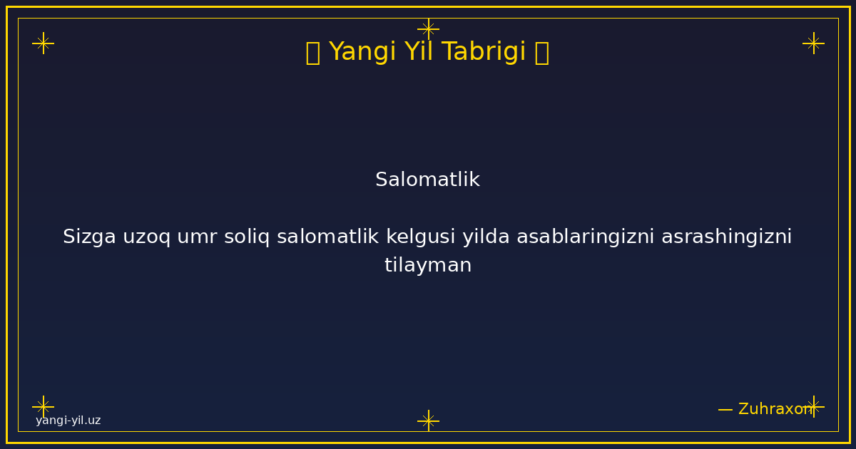 Yangi yil sizga sog‘lik, baxt, xotirjamlik va baraka olib kelsin. Har bir kuningiz quvonchga, har bir qadamigiz omadga to‘la bo‘lsin. Orzularingiz amalga oshib, hayotingizda faqat yorug‘ kunlar hukm sursin. Yangi …