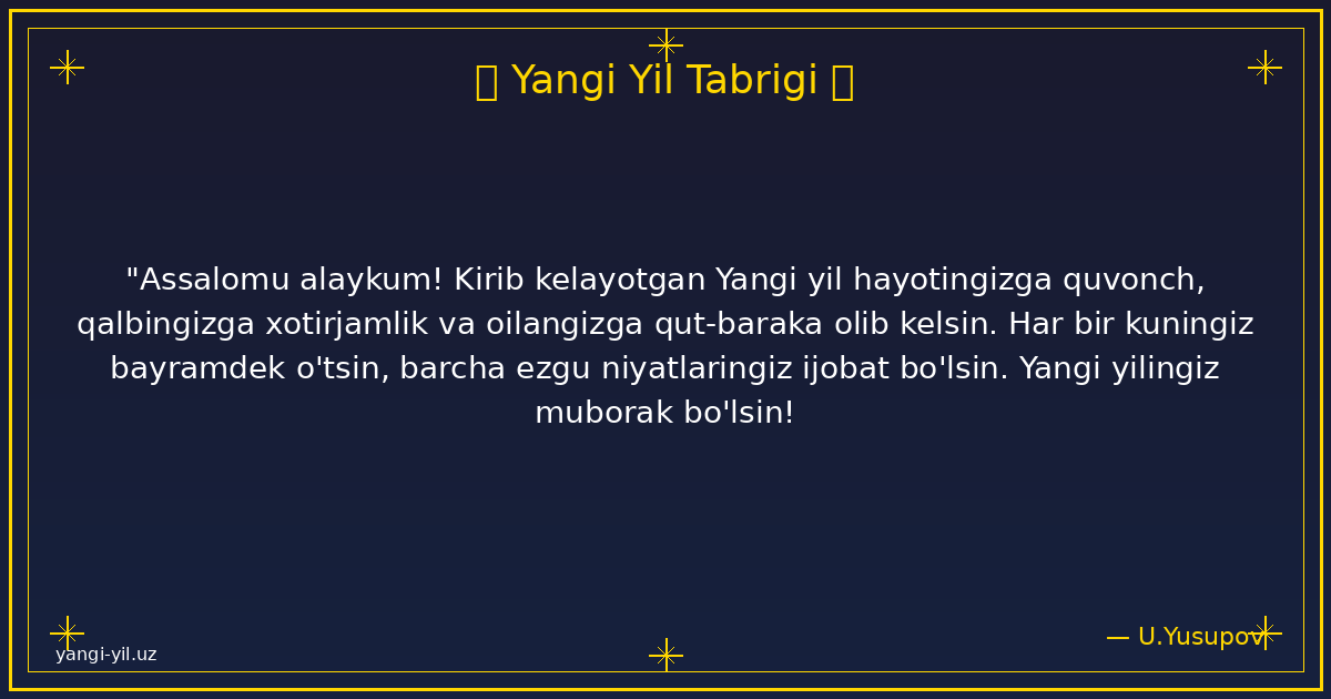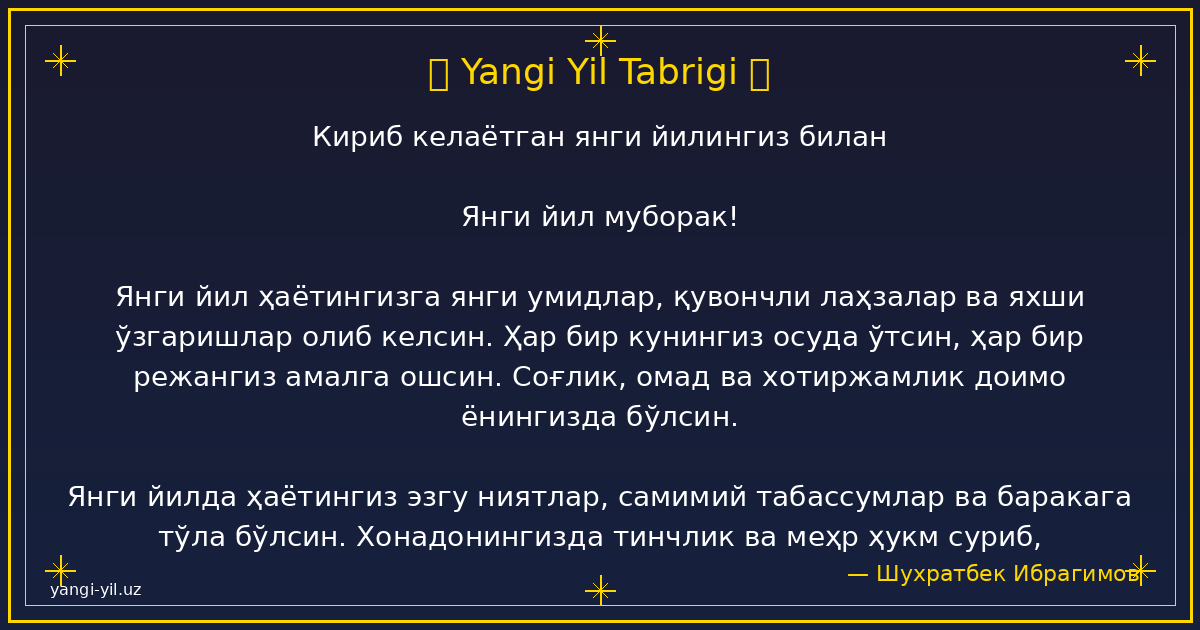 "Assalomu alaykum! Kirib kelayotgan Yangi yil hayotingizga quvonch, qalbingizga xotirjamlik va oilangizga qut-baraka olib kelsin. Har bir kuningiz bayramdek o'tsin, barcha ezgu niyatlaringiz ijobat bo'lsin. Yangi yilingiz muborak bo'lsin!