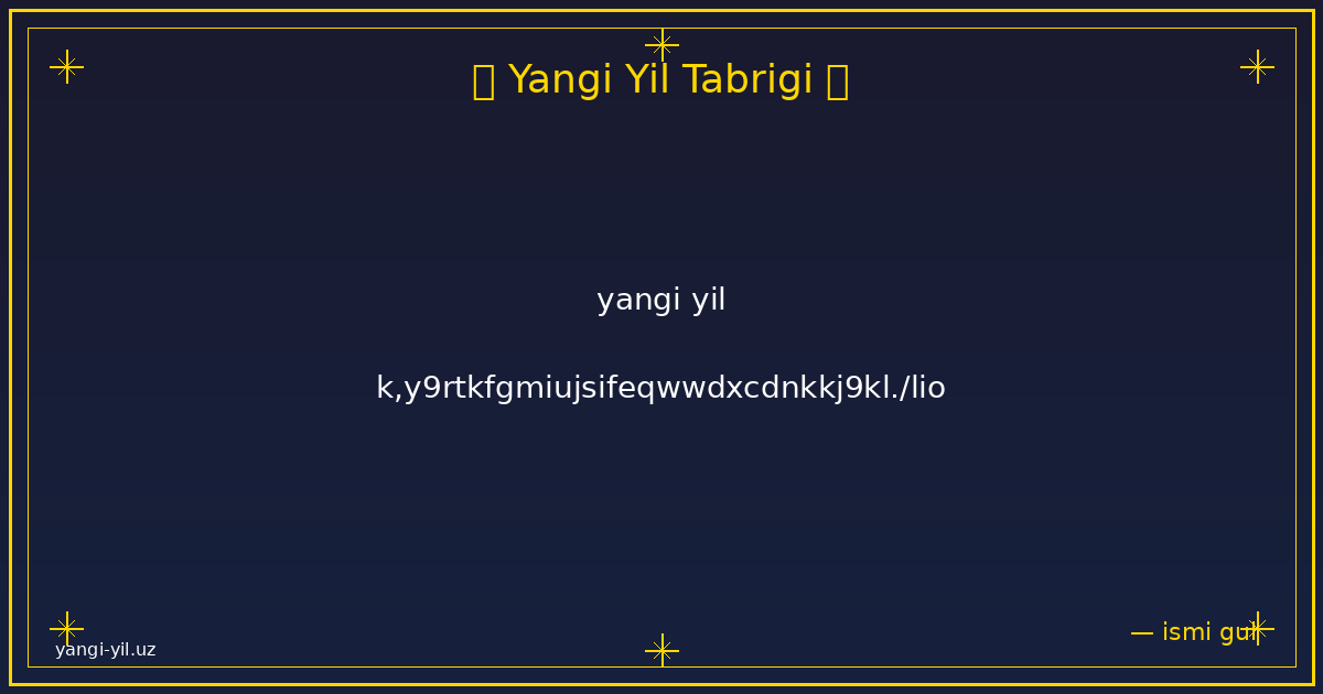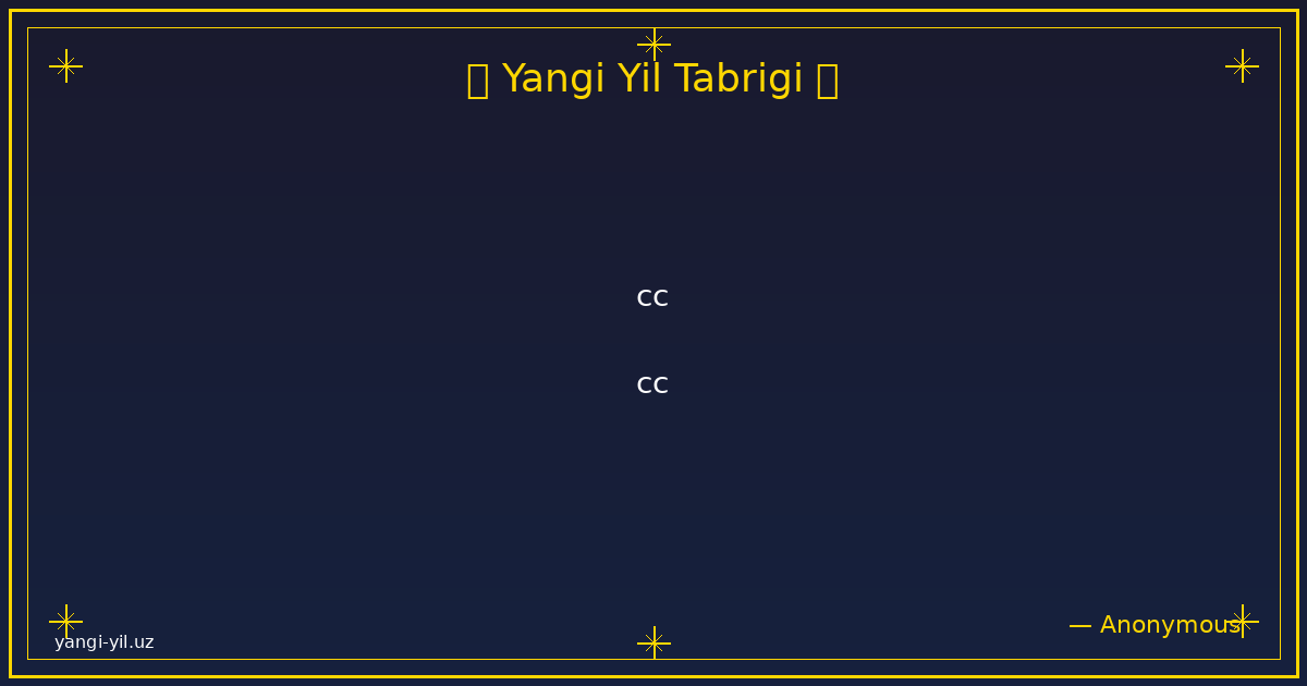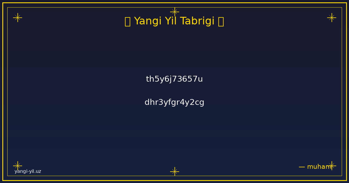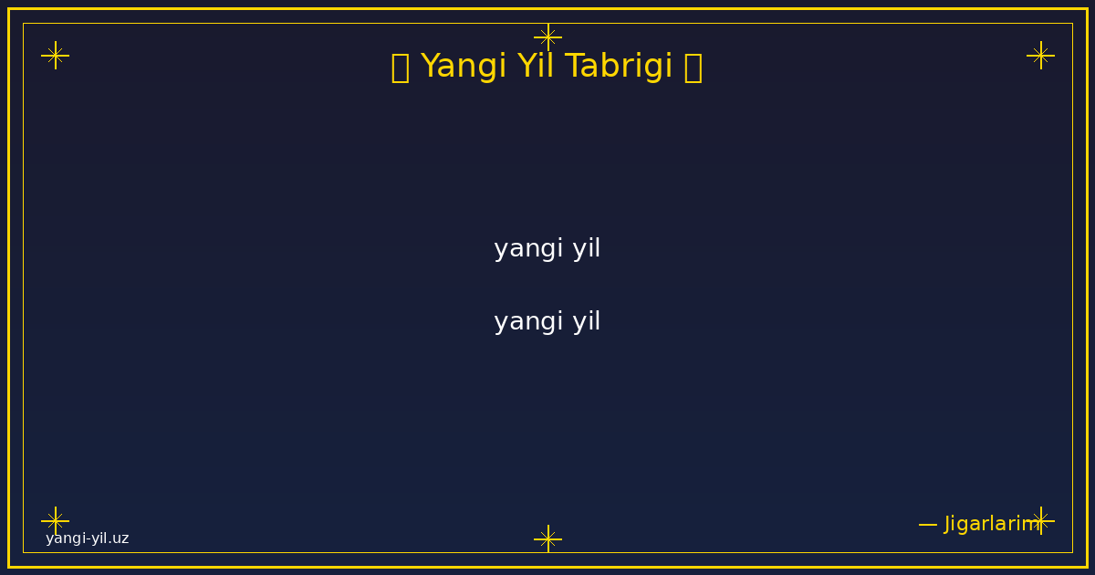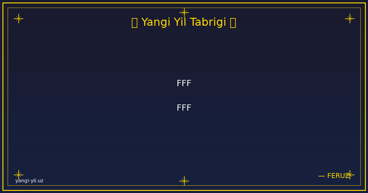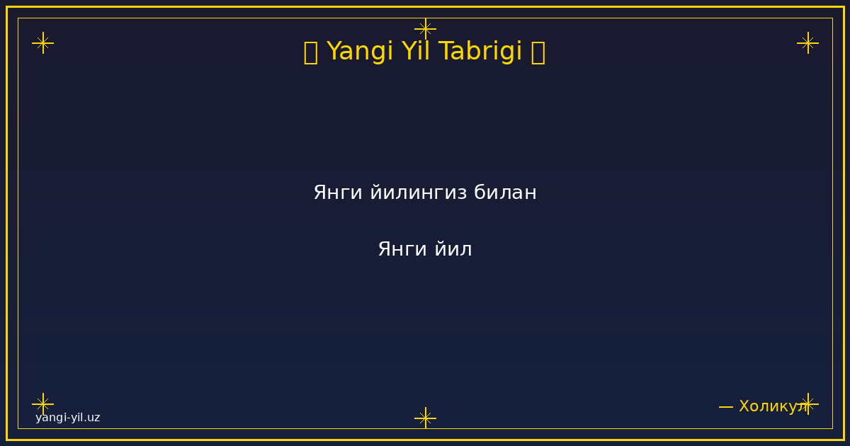 Янги йил муборак! Янги йил ҳаётингизга янги умидлар, қувончли лаҳзалар ва яхши ўзгаришлар олиб келсин. Ҳар бир кунингиз осуда ўтсин, ҳар бир режангиз амалга ошсин. Соғлик, омад ва хотиржамлик доимо …