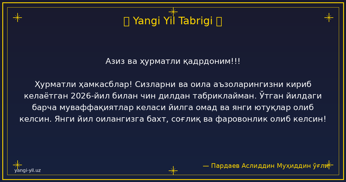 Қадрли дўстлар ва ҳурматли ҳамкасблар! Янги 2026-йил ҳар бирингиз учун янгидан-яна янгидан имкониятлар, катта мақсадлар ва чиройли натижалар олиб келсин. Бу йил қалбларимизга хотиржамлик, хонадонларимизга барака, иш фаолиятимизга эса омад …